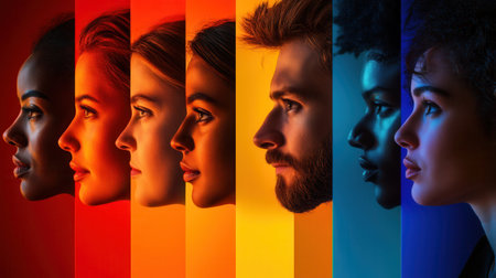 Row of diverse men and women facing sideways with multicolored gradient symbolizing inclusion and equity. Representation of multiracial group.