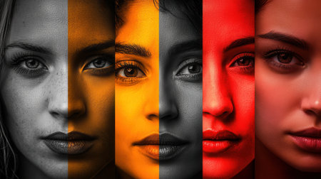 A collage of close-up faces, each with a different color overlay, highlighting the diversity and beauty of human faces.