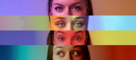 Collage of close-up male and female eyes isolated on colored backgorund with copy space for ads. Multicolored stripes. Concept of equality