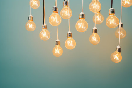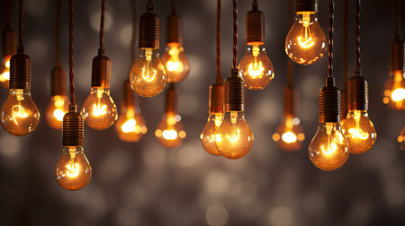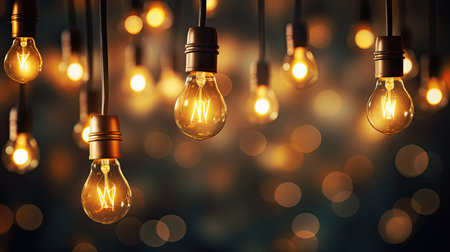 A detailed shot of multiple hanging light bulbs with a warm, glowing filament, set against a bokeh background.