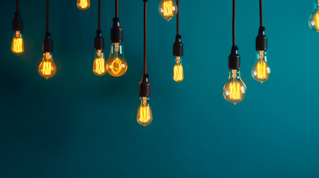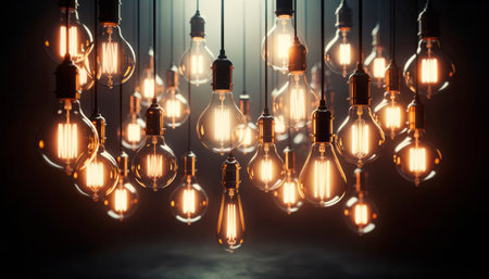 A dynamic cluster of glowing Edison bulbs hanging, casting a warm light with visible filaments, suitable for mood lighting.. AI Generation