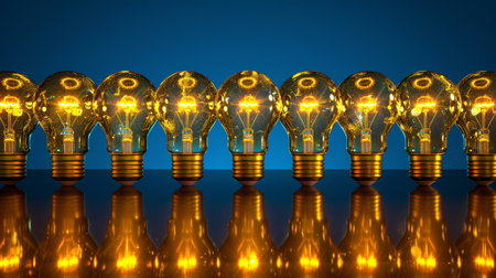 Vintage incandescent light bulbs with warm glow on rich blue background retro 3d render