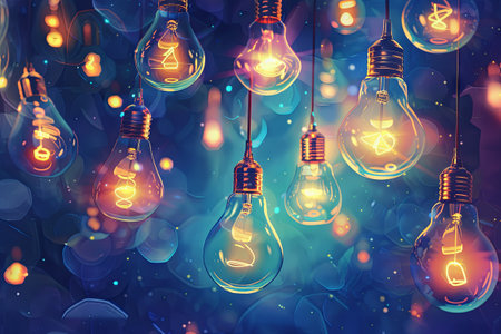 Glowing bulbs hanging against a bokeh blue background, illuminating the dark