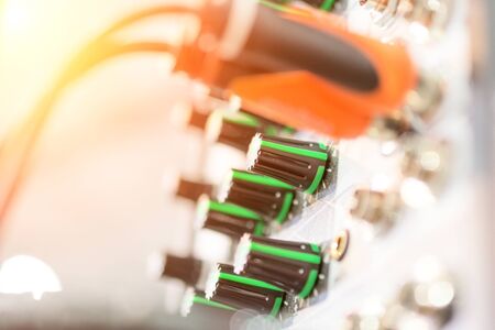 audio ports and audio jack and wires connected to audio mixer, music dj equipment at concert