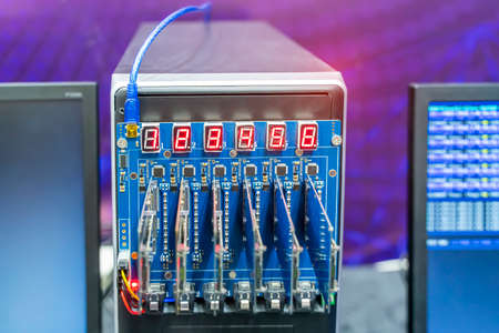 Microchips are stacked on top of each other on metal plates in the manufacture of super modern powerful computer equipment for a modern cardiology clinic. Powerful specialized computers concept