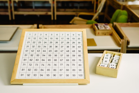 Wooden numbers in tables to learn mathematics in a Montessori classroom.