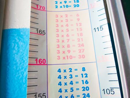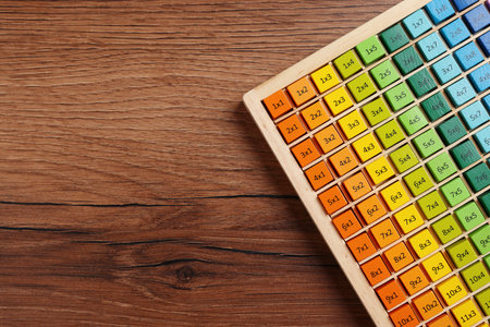 Multiplication table . Macro mode. Colored wooden cubes. Teaching children math and numeracy. Mental math.