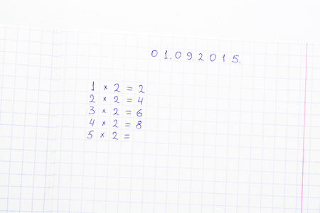 child learns the multiplication table at a desk, homework, a lesson in mathematics. independent study of school subjects