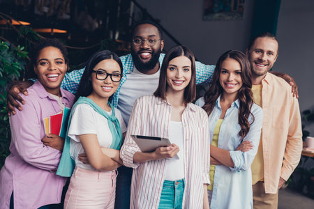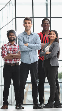 Team of multy-ethnic group of business people standing at the office and smiling at camera