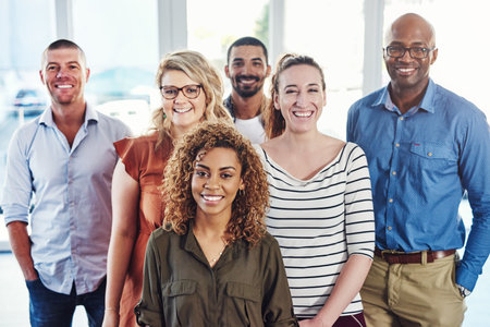 Happy business people, portrait and team with diversity, smile and working together for professional collaboration. Support, solidarity and community in office, workplace and employee group about us