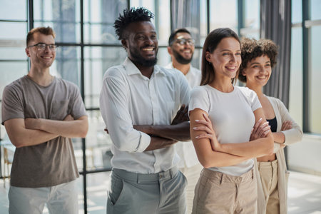 Young confident positive multiracial company staff professionals standing together opposite wall looking at camera. Diverse group business people employees posing in the office successful team concept