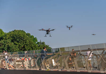 Estonia, Tallinn - June 15, 2018: Drone with camera flying over sea . The Mavic is a new drone design by DJI