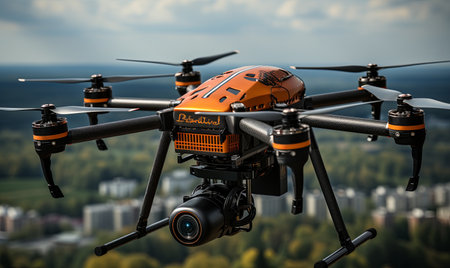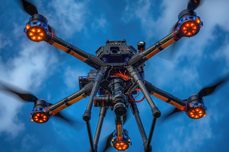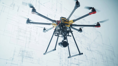 A striking image of a high-tech multirotor drone hovering against a digital blueprint background. This visual captures the essence of innovation and modern technology.