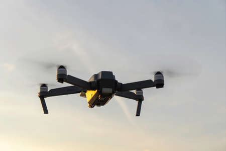 Close up of professional remote control drone flying against dramatic sunset sky background.