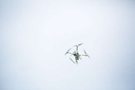 Ufa, Russia. - August 8, 2016: White drone, quadrocopter with photo camera flying in the blue sky.