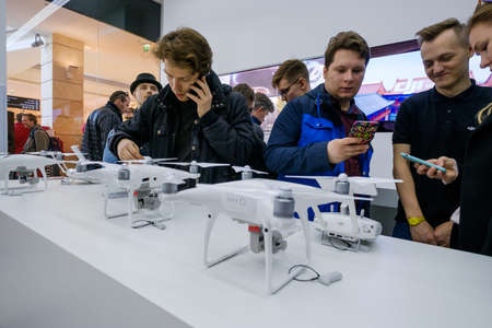 Moscow, Russia - April 1, 2017: Customers watch quadrocopters at the opening of DJI Authorized Store