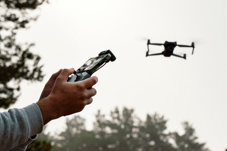 Photograph of man's hands holding the remote control of a Drone (Drone Operator). Technology concept. man is having fun with a quadcopter in nature. control panel of the UAV in male hands is close-up.