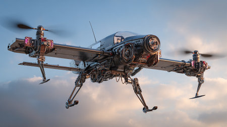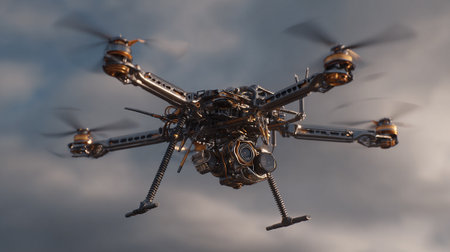 This image showcases a sophisticated futuristic drone hovering in the air, featuring detailed machinery, multiple rotors, advanced technology and a metallic exterior, set against a sky backdrop.