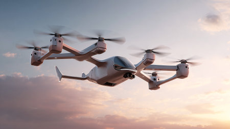 An advanced white quadcopter drone with spinning rotors floats against a picturesque sky filled with soft pastel clouds, suggesting futuristic transportation and technological innovation during the golden hour.
