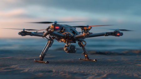 A sleek drone hovers in the dusk sky, capturing breathtaking vistas of a lush landscape below. Its bright lights reflect the serene beauty of twilight as nature unfolds.