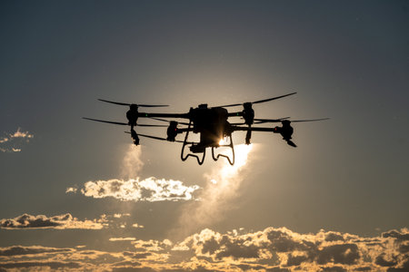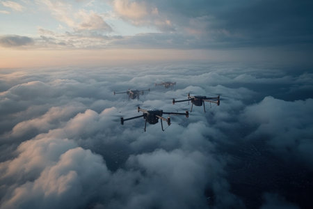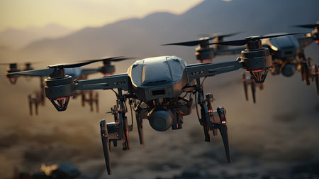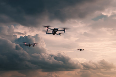 Drones squadron flying in a dark sunset sky, representing technology, communication, and future innovation