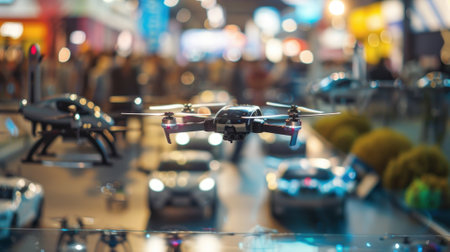 A defocused view of futuristic cars and drones on display at a bustling tech convention