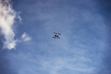 A drone or quadrocopter flies against a blue sky. Modern technology for photographing and filming a bird's eye view.