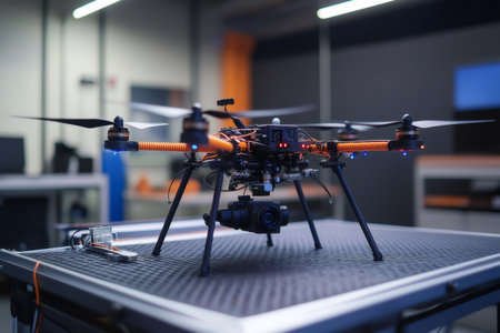 Modern drone with camera and sensors standing on a table in a laboratory, ready for flight and data acquisition