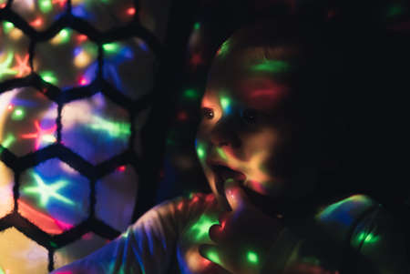 portrait of a young child mesmerized by colorful star-shaped lights. High quality photo