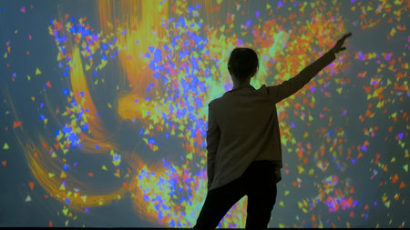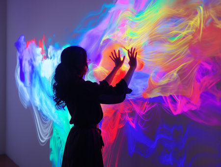 Silhouette of a woman engaging with a colorful and dynamic light display that forms abstract patterns on the wall.