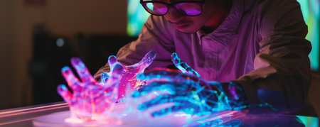 A digital artist creating 3D holographic sculptures in an open studio using motioncontrolled gloves