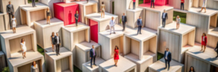 Banner, template image. A various blurry business people in cube 3D structures. Business and finance concept.3D render. 3D Illustration background.
