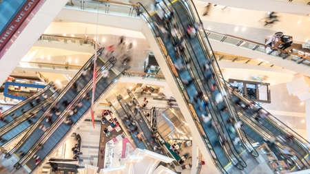 Bangkok, Thailand - Oct 23, 2019: Top view motion blurred of crowded Asian people using escalators in modern shopping mall. Asia city life, shopping lifestyle, commuter transportation concept