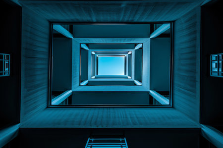Futuristic steel staircase reflects bright blue light generated by artificial intelligence