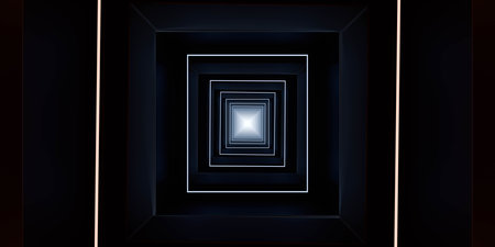 A hexagonal tunnel viewed from the inside looking towards a vanishing point with glowing white and orange lights along the edges.