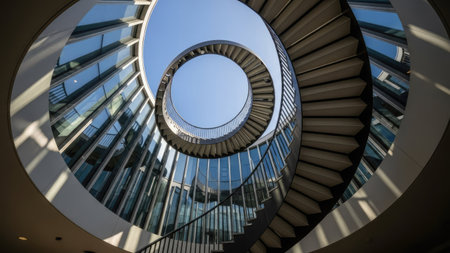 Aerial view of a spiral staircase inside a modern building. Abstract architectural background.