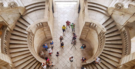 BUDAPEST - May 05, 2019: People take photo old spiral staircase, spiral stairway inside an old house in Budapest. Project Budapest 100