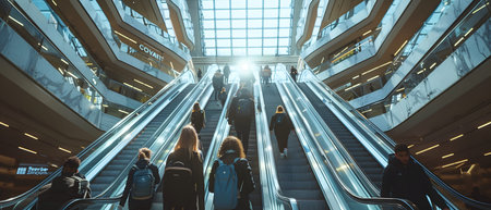 A group of people moving upwards on escalators within a modern building, illuminated by natural light streaming through a glass ceiling. The architectural design features layered balconies and a sense of dynamic movement.