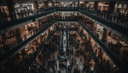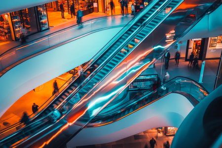 Vibrant shopping mall scene with busy escalators and fashion brands for dynamic promotional content