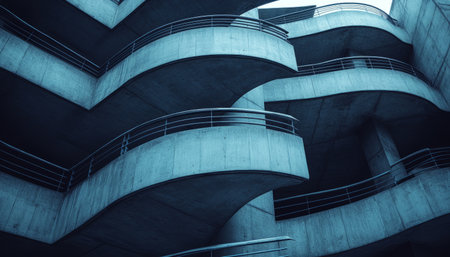 A low-angle perspective of a concrete spiral staircase with metal railings.