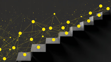 This abstract image features a stairway intertwined with digital networks and yellow nodes, symbolizing growth, innovation, and connectivity.