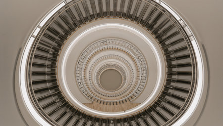 Witness the spiral staircase in the Vatican Museums from above, showcasing its elegant curves and ornate details while light fades towards the center.