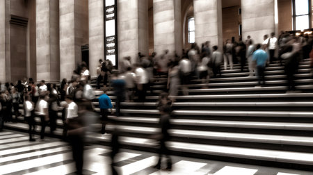 Silhouetted people walk on multiple levels of sleek, modern staircases in a glass-walled building.