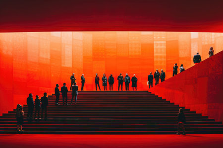A vast red-lit hall with silhouetted figures standing in the distance, creating a mysterious and grand atmosphere