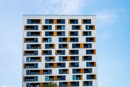 A fragment of a modern architectural facade, residential building against a cloudy sky. The contemporary design of the high rise showcases a blend of geometric shapes, creating a striking visual.