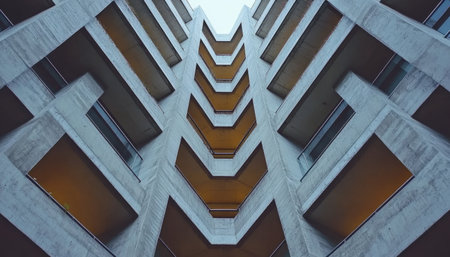 A low angle perspective of a concrete building showcasing its geometric design and balconies.