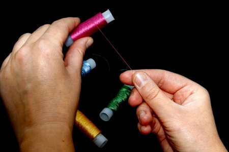 Used tailoring treads on the table with human hands focused on top