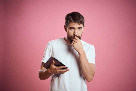 Man advertises a tablet on a pink background codes Space cropped view of emotions white t-shirt model new technologies