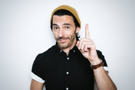 Portrait of a handsome man pointing finger up