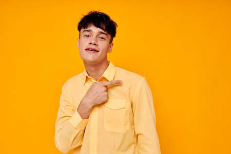 cheerful man in yellow shirt posing fashion gesture with hands